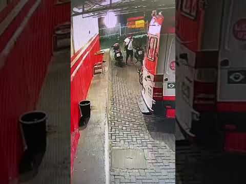 O suspeito andou pela garagem visualizou motos mas depois entrou em uma na ambulância que estava com a chave na ignição e furtou o carro pelo portão principal da garagem.
